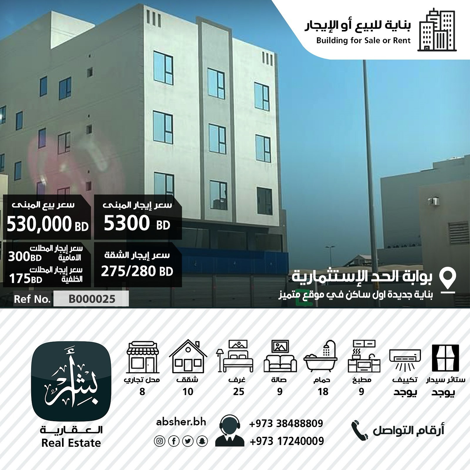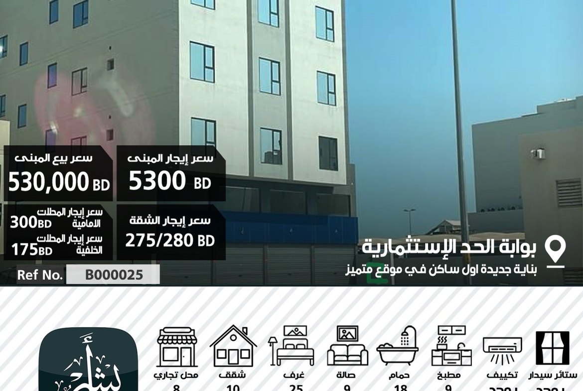 For sale or for rent a building in the investment gate of Al-Hadd, a new building, the first resident in a distinguished location