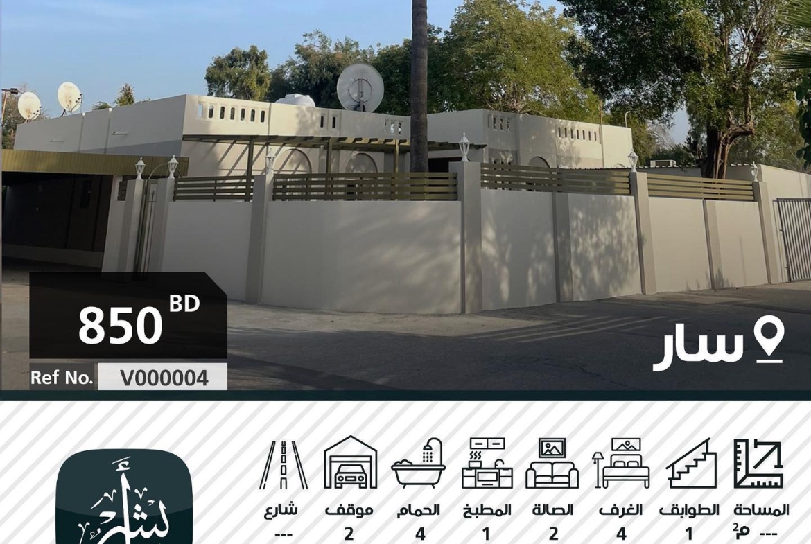 فيلا للإيجار في سار ، طابق واحد ، ٤ غرف ، صالتين ، مطبخ ، ٤ حمامات ، موقفين