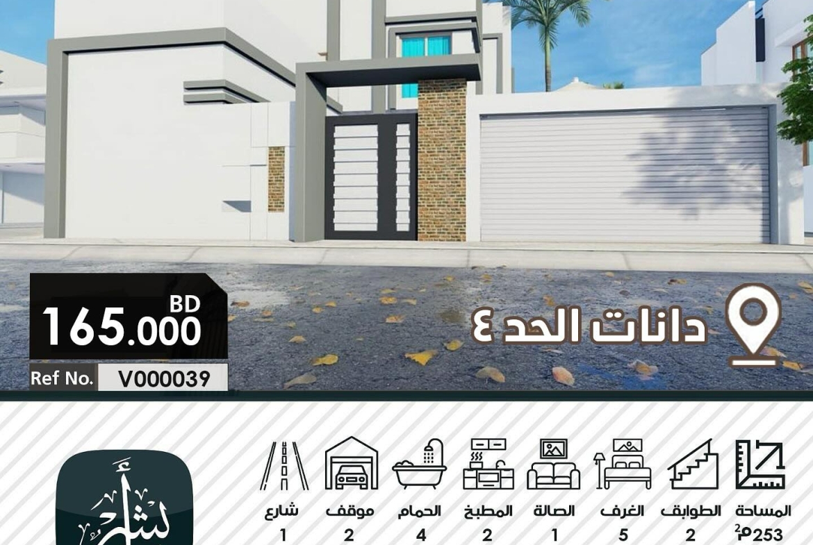 للبيع فيلا طابقين في دانات الحد مساحتها 253 مكونة من 5 غرف وصالة ومطبخين وعدد 4 حمامات و2 للسيارات