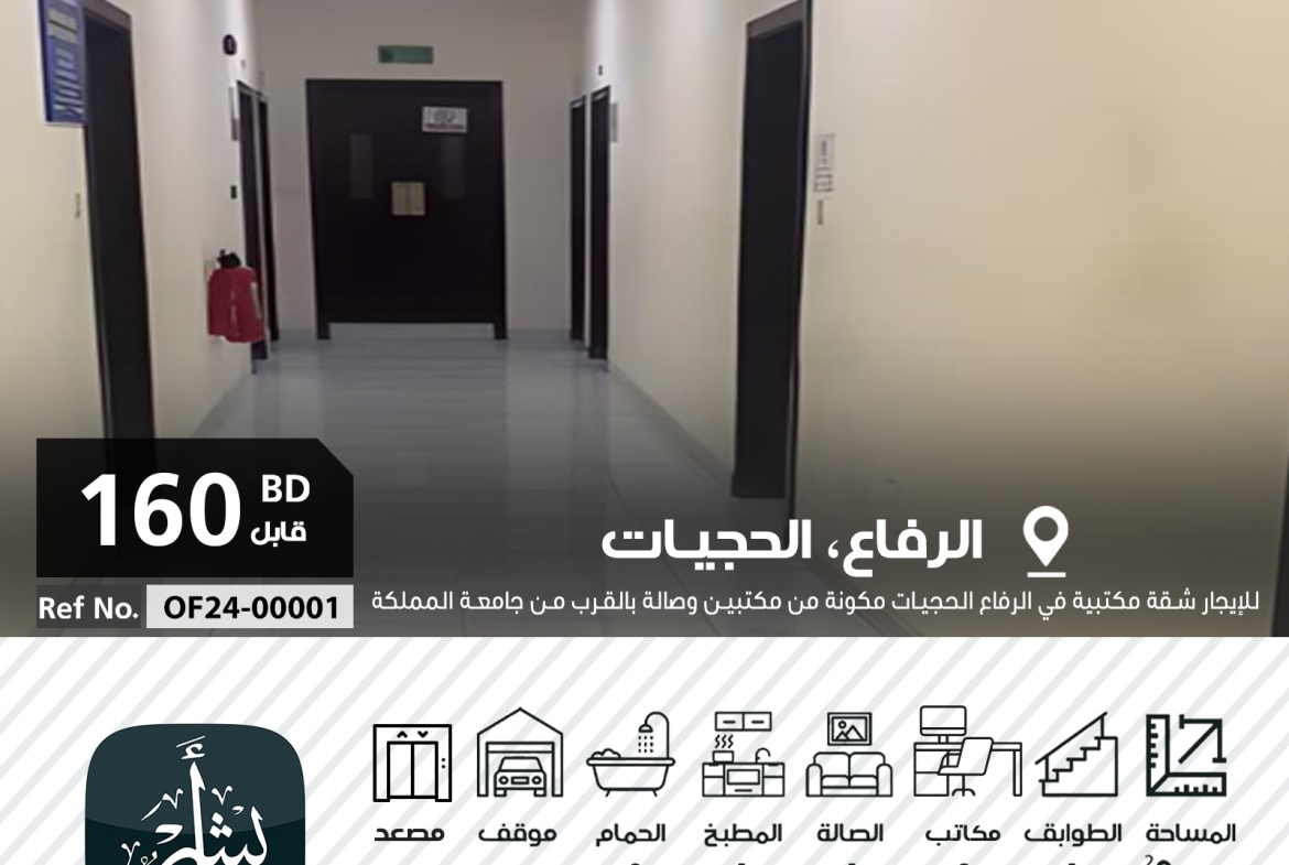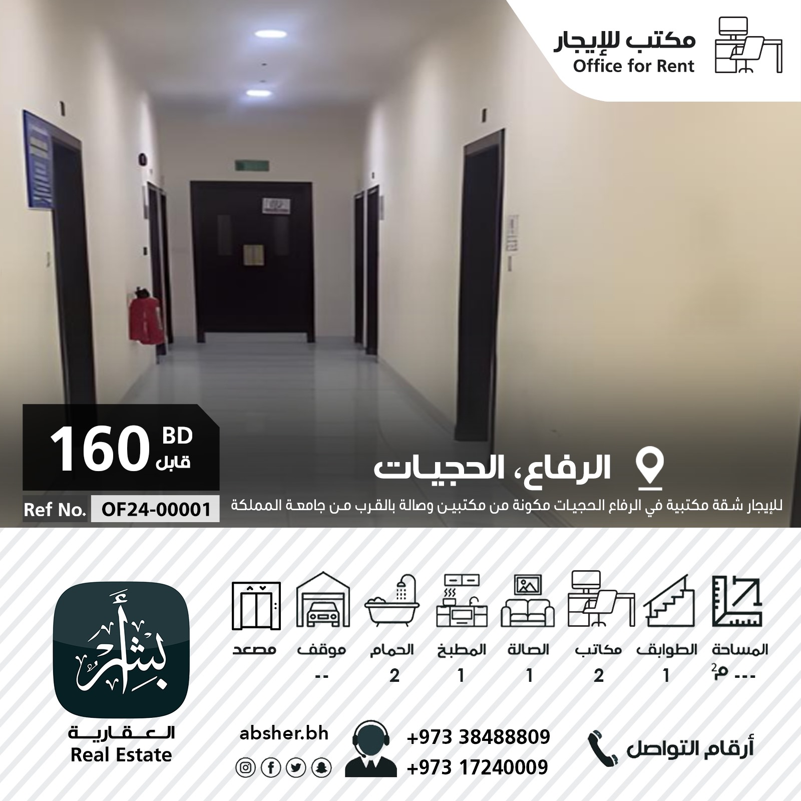 للإيجار شقة مكتبية في الرفاع الحجيات قرب جامعة المملكة ، في الطابق الاول مكونة من مكتبين و صالة و مطبخ و حمامين